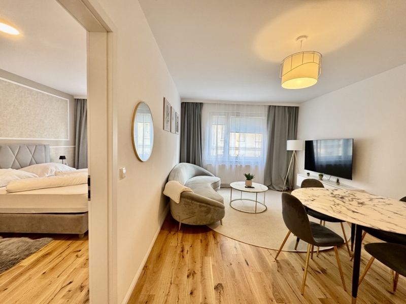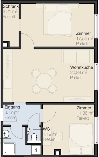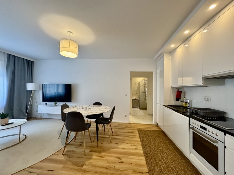 Diese sehr gut geschnittene Wohnung bietet einen Vorraum, eine Wohnküche, 2 Schlafzimmer- davon eines mit begehbarem Kleiderschrank, ein Badezimmer mit Dusche und Waschmaschinenanschluss sowie 1 separates WC.